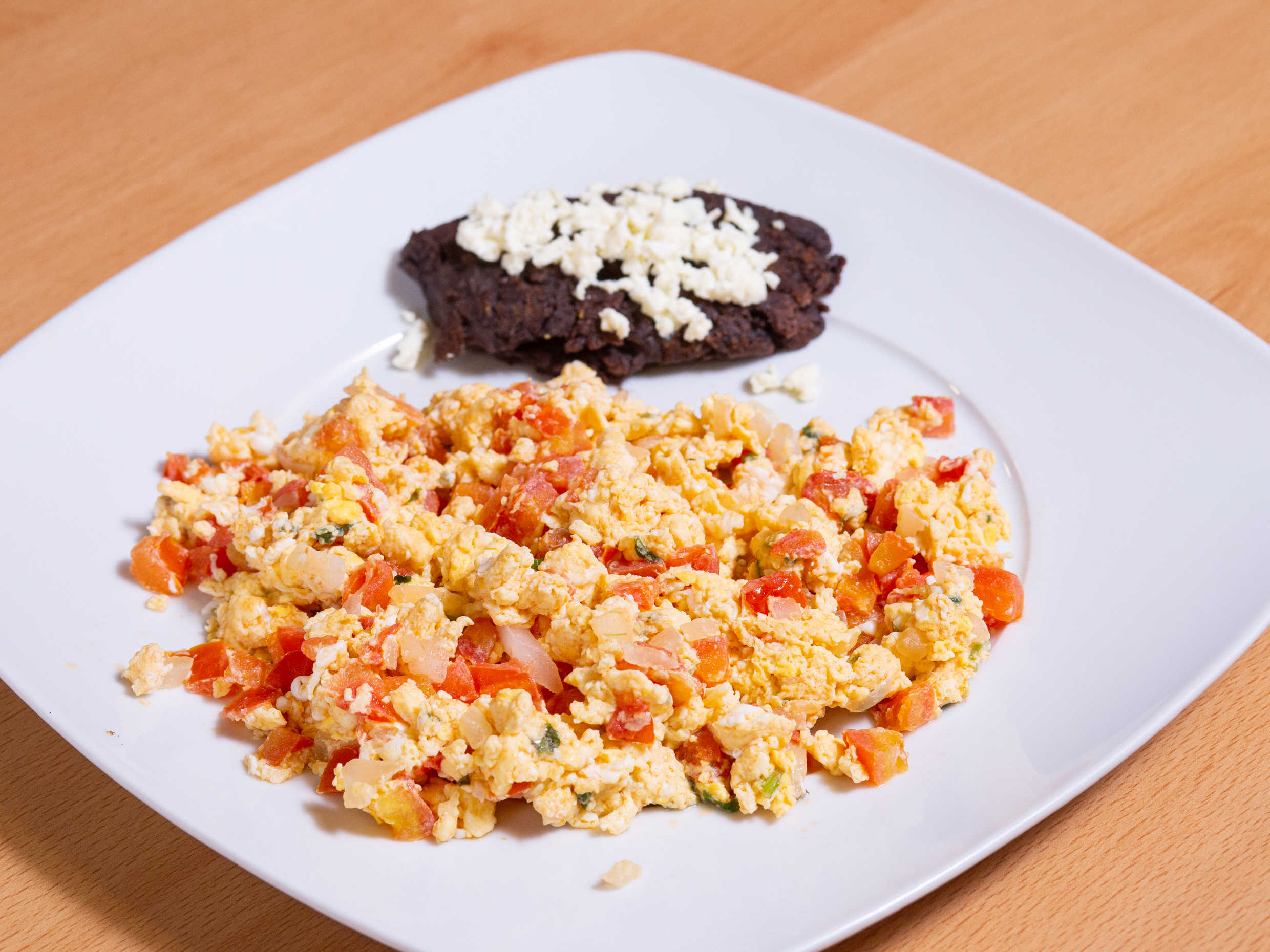 Huevos a la mexicana acompañados de frijoles refritos con queso.