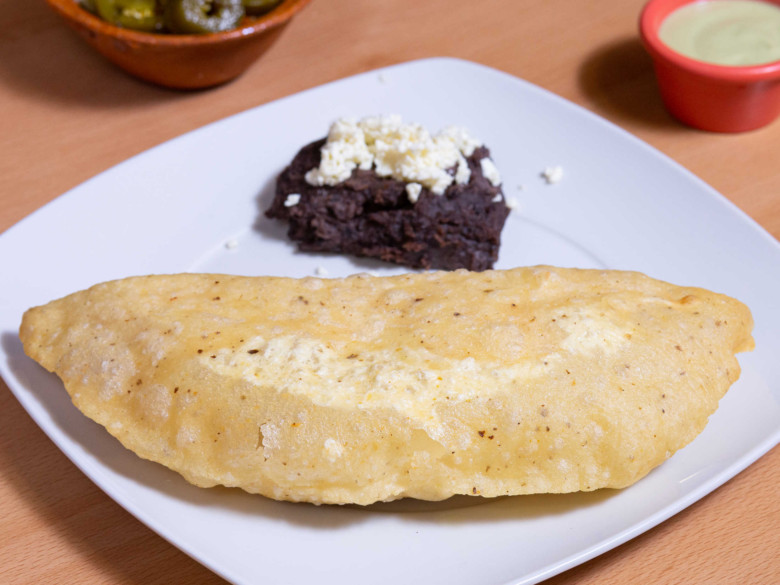 Rellena con queso oaxaca, preparada con lechuga, crema y queso con guarnición de frijoles refritos.
