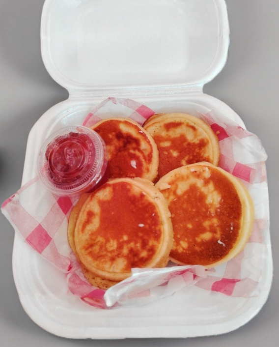 4 piezas demini hot cakes, incluye sus complementos, miel,mermelada y/o lechera.