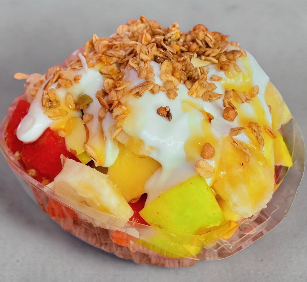 Incluye sandia, melon, papaya, manzana y platano, arriba agregamos yogurth griego, miel y granola.
