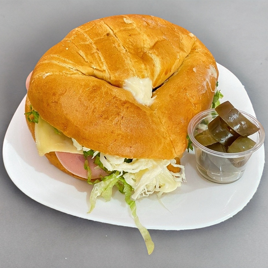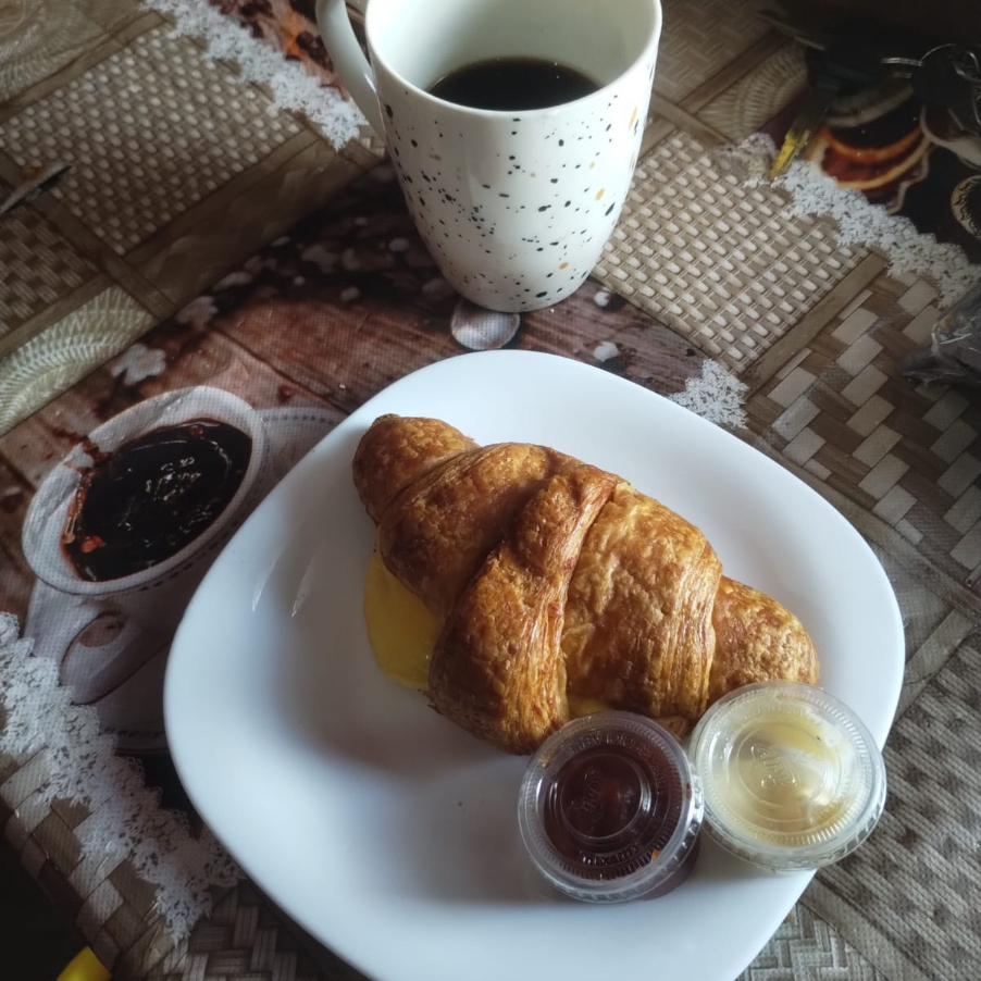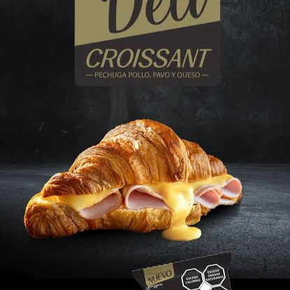 Croissant de jamón de pollo y pavo, con queso manchego y aderezo de mayonesa con chipotle, acompañado de catsup.