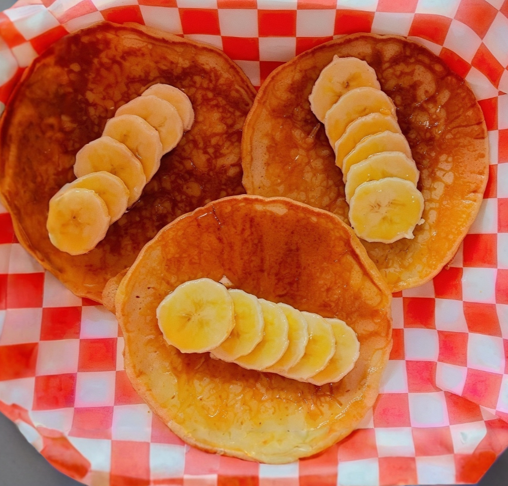 1 pieza de hot cakes, con su complemento, miel, lechera o mermelada.
