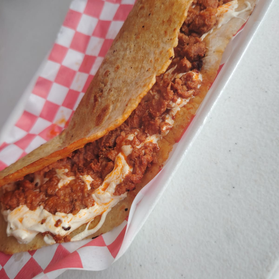 Tortilla a mano preparda con queso de hebra y un guiso a elegir. Pollo, picadillo, pibil o longaniza.