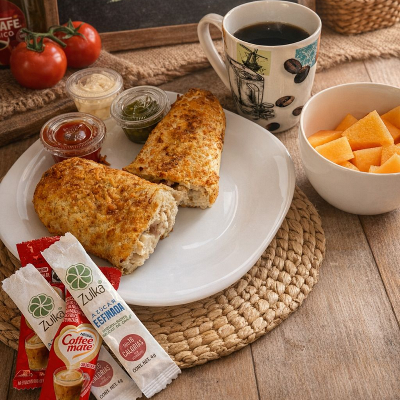 Rollo de pollo horneado*1 + Cafe americano*1 + Porción fruta*1