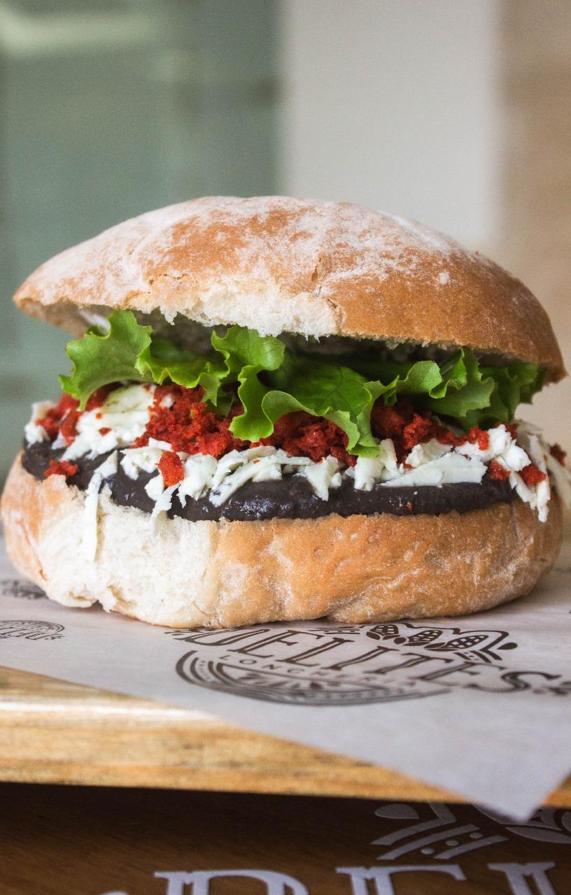 Pierna envinada con frijol, mayonesa, queso manchego, aguacate y tomate.
