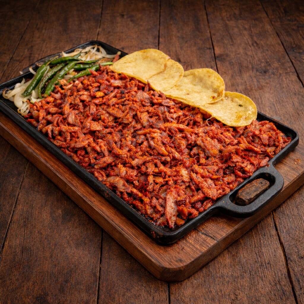 500g de nuestra deliciosa chuleta, el cual incluye: 2 volcanes con queso,cebolla asada con chiles toreados,dos salsas tradicionales (verde y roja),limones,verduras y 20 tortillas.