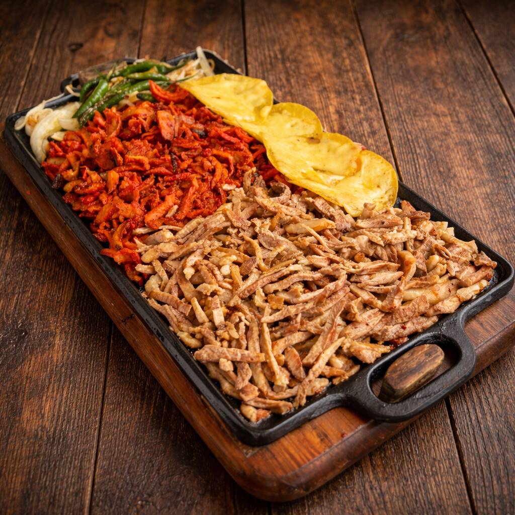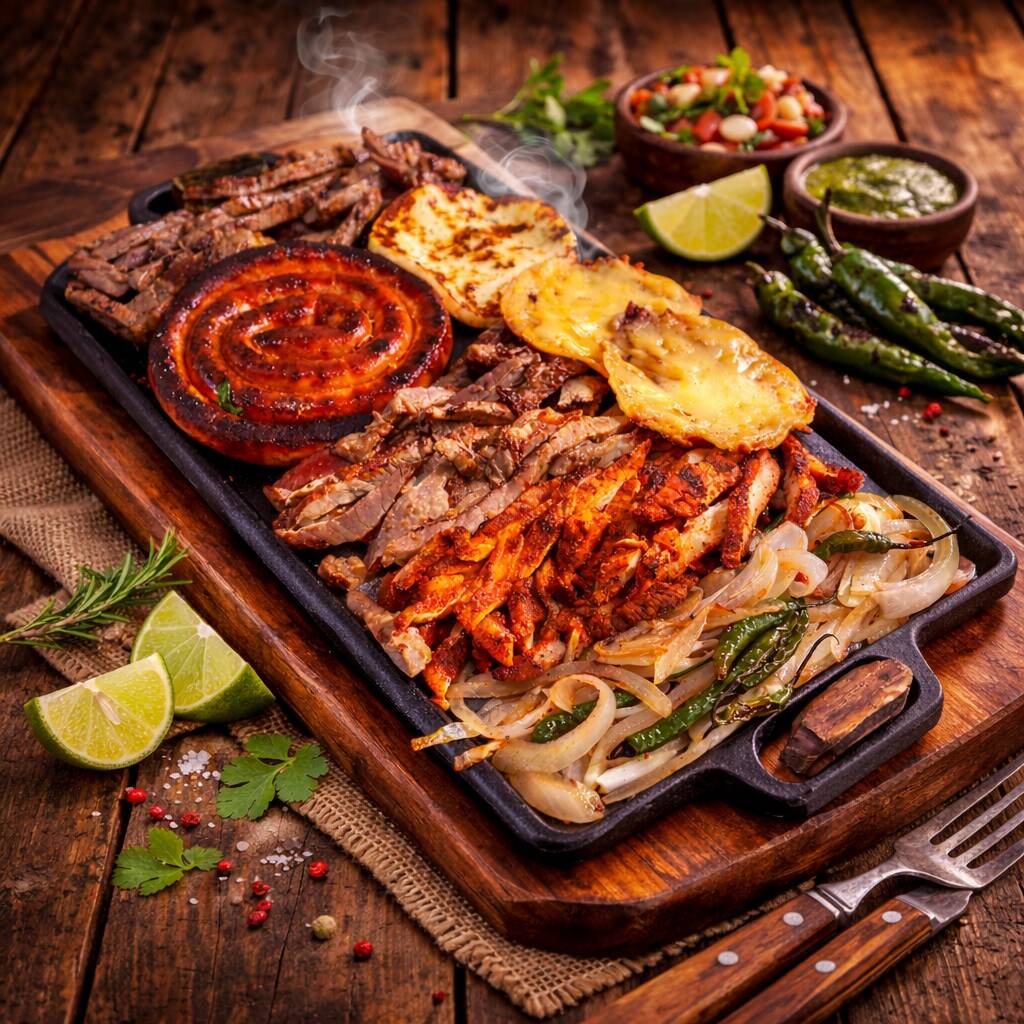 (Asada de res c/ fajitas de pollo)INCLUYE:Frijoles Refritos,Guacamole,Arroz,Verduras,Cebolla Asada con Chiles Toreados,Queso Asadero,Salsa Verde y Limones.