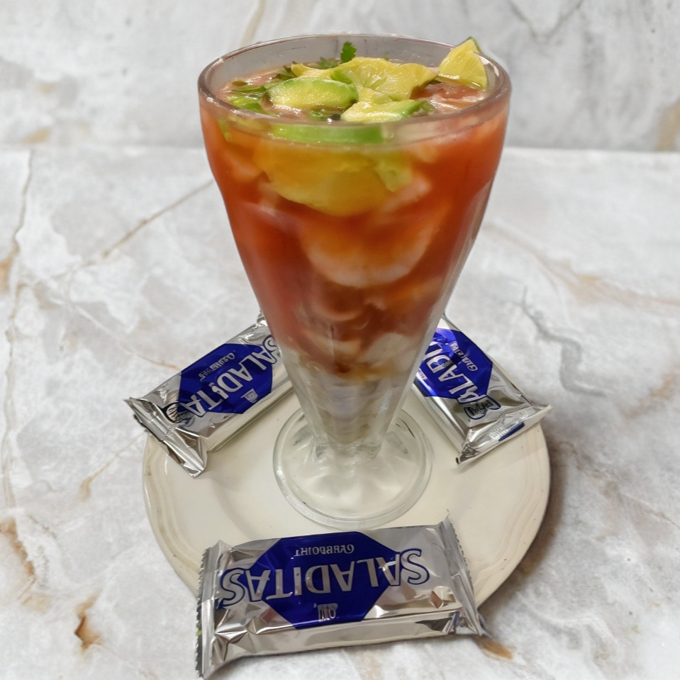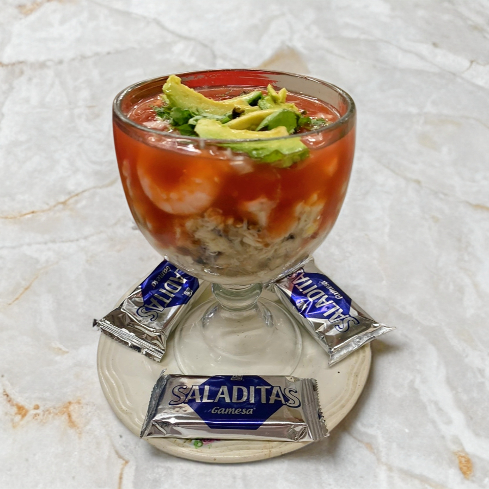 Coctel de hasta 5 ingredientes con cebolla, cilantro, aguacate, salsa cátsup preparada y aceite de oliva. Ingredientes a escoger camarón, jaiba, pulpo, caracol, ostión (sin cebolla, sin cilantro o sin aguacate).