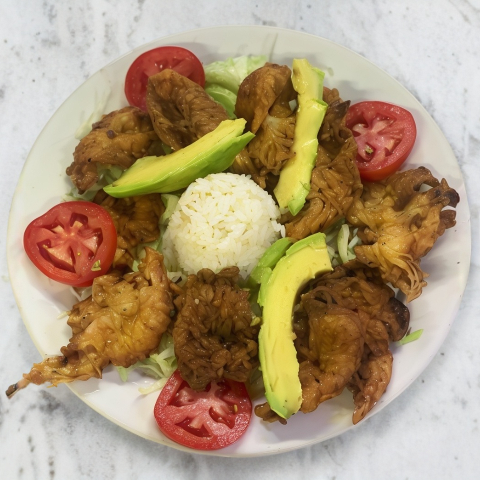 Camarones sazonados y salteados (con cascara o sin cascara) con cebolla blanca fileteada bañados en una salsa de chipotle y acompañados de arroz y ensalada verde, con 2 opciones de chipotle normal o chipotle dulce.