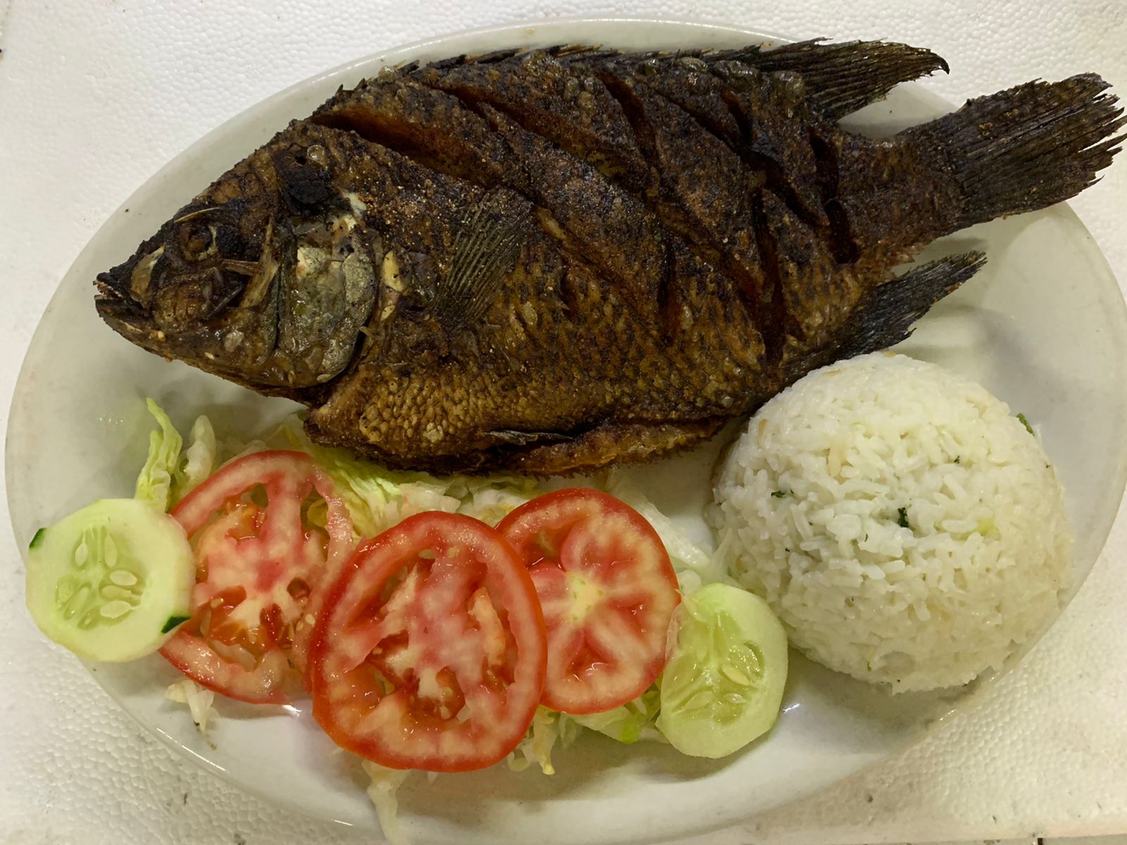 Mojarra frita sazonada y acompañada con arroz y ensalada.