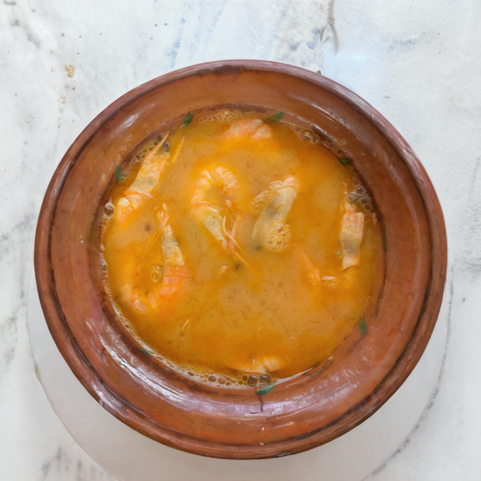 Caldo rojo a base de chile guajillo, con epazote y camarones acompañados con totopos, salsa y limones.