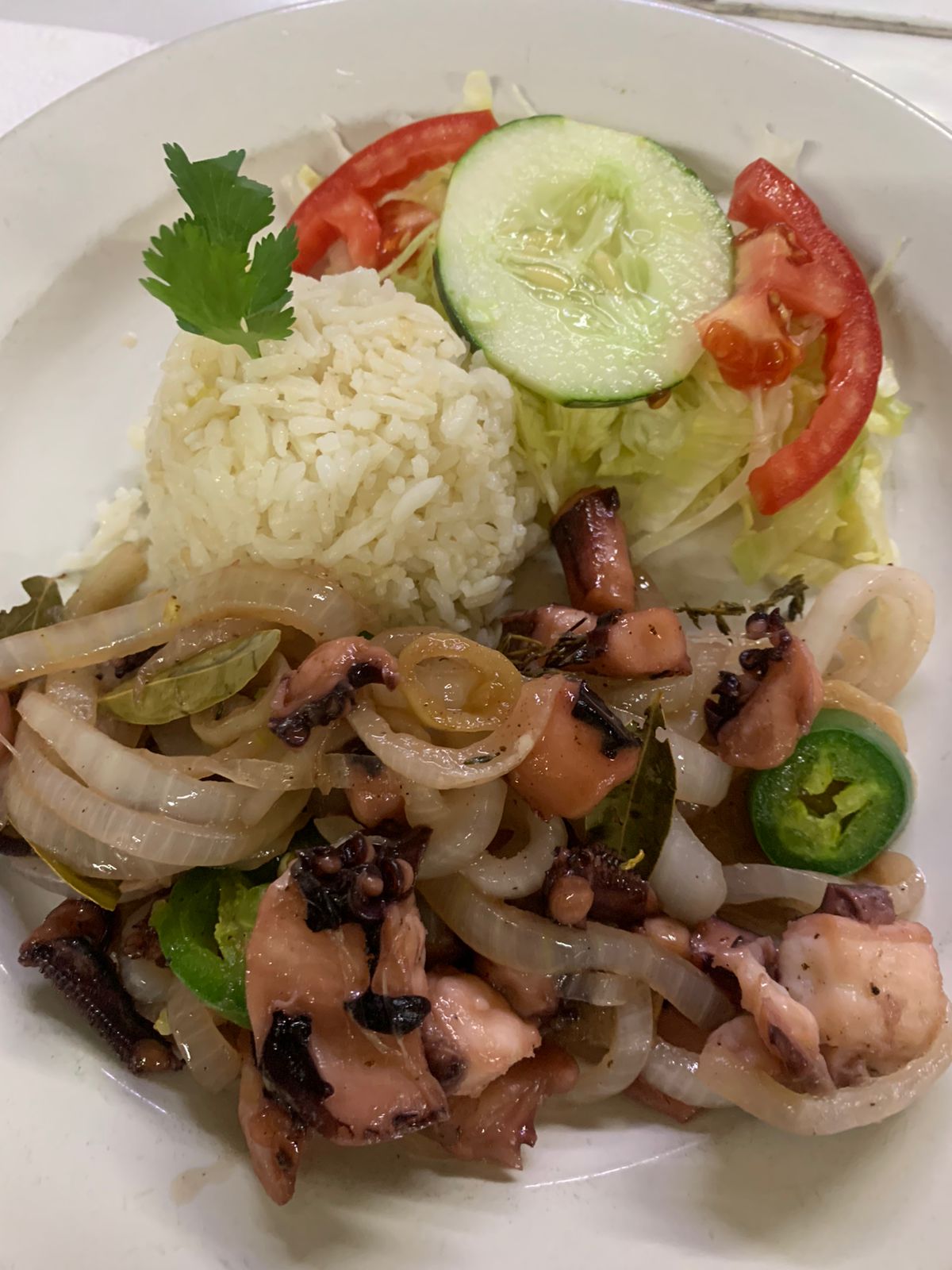 Pulpos salteados en cebolla blanca fileteada, chile jalapeño con un toque de mantequilla y acompañados de arroz y ensalada verde.