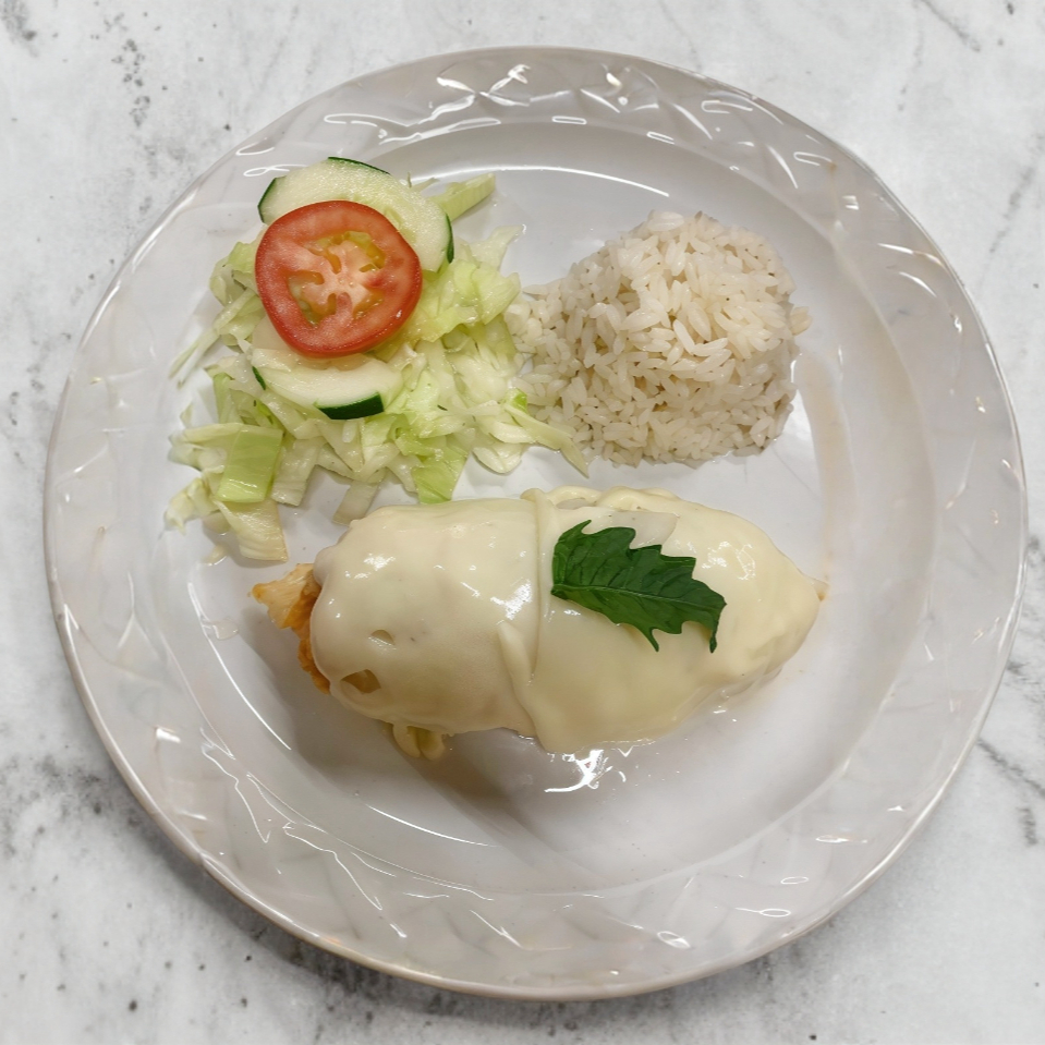 Filete relleno de camarón, pulpo, caracol guisado y gratinado con queso manchego. Acompañado de arroz y ensalada. Observaciones en caso de no querer (camarón, jaiba, pulpo o caracol).