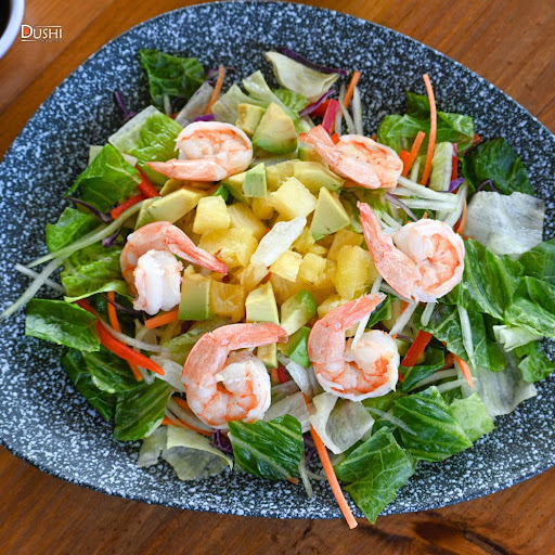 Mix de lechuga, morrón rojo, pepino rallado, aguacate, camarón, piña y vinagreta de la casa