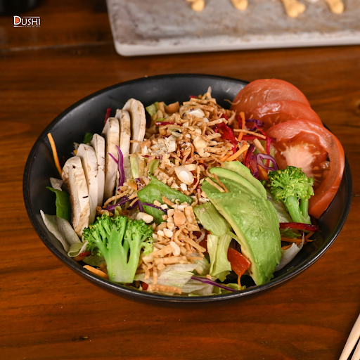 Lechugas, col, brócoli, champiñón, zanahoria, aguacate, tomate, pollo, ajonjolí y aderezo mil islas