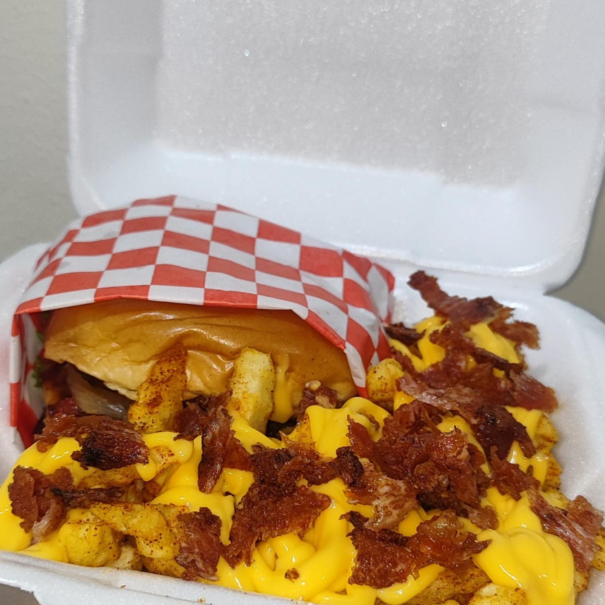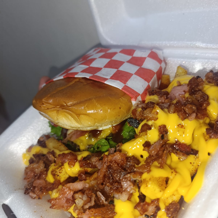 Carne de Res, Pan Brioche, Queso Americano, Queso Manchego, Mayonesa, Lechuga, Salsa BBQ Con Tocino y Papas fritas a la francesa