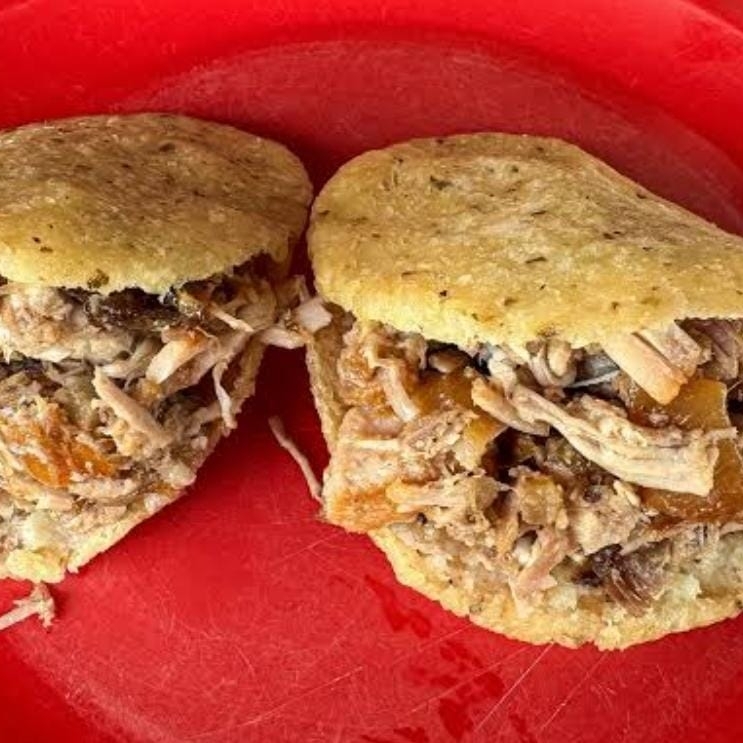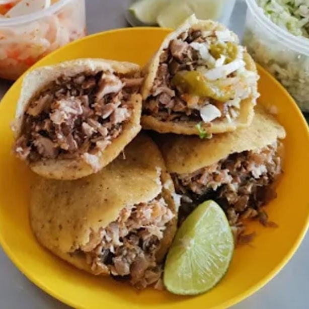 Tortilla de maíz rellena de carne de cerdo sofrita con adobo de la casa. Acompañado de rábano, Col preparada y limón.