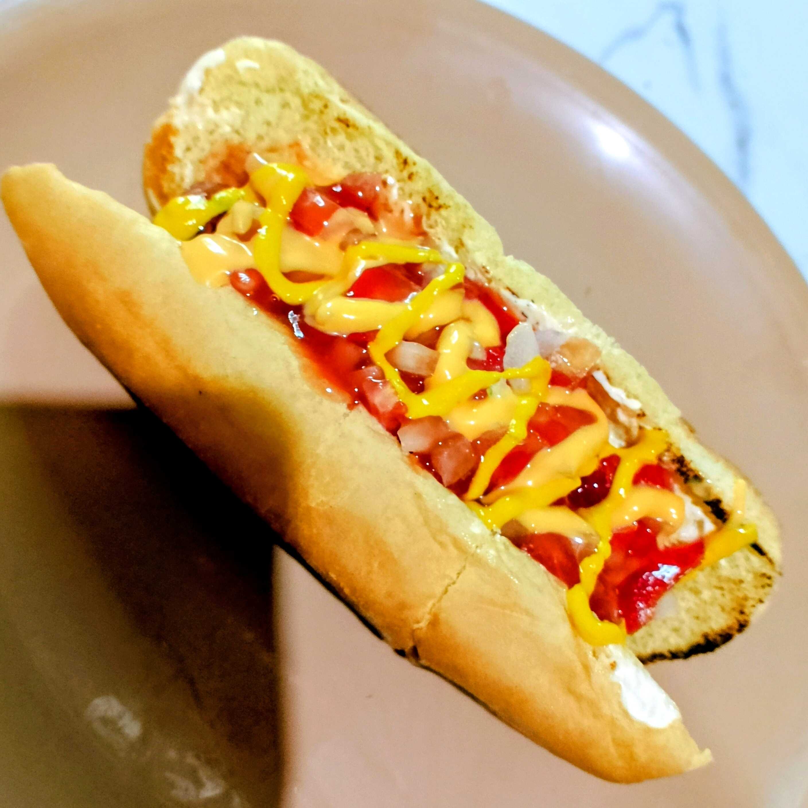 Pan para hot dog, salchicha, tomate, cebolla, mostaza, capsut, queso amarillo