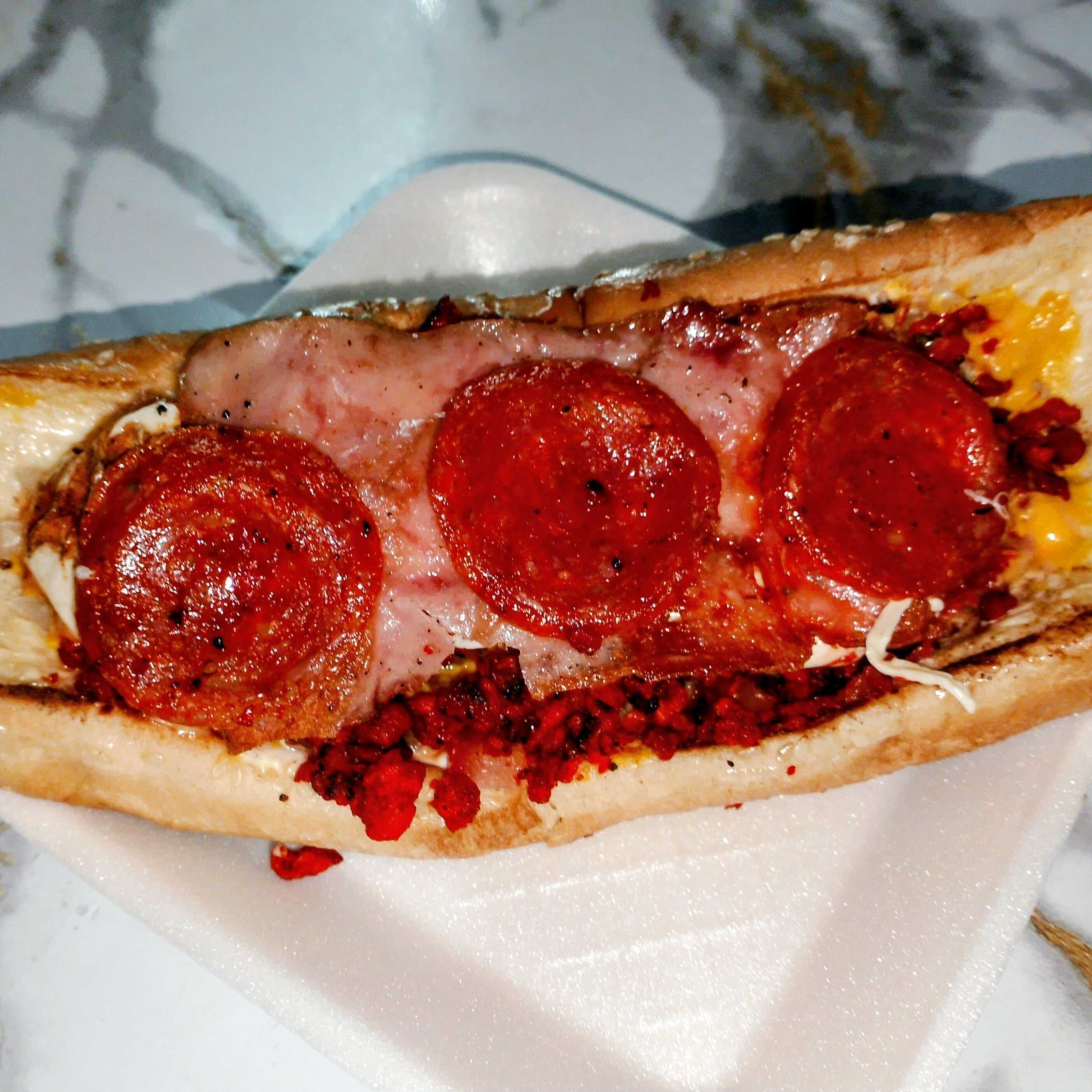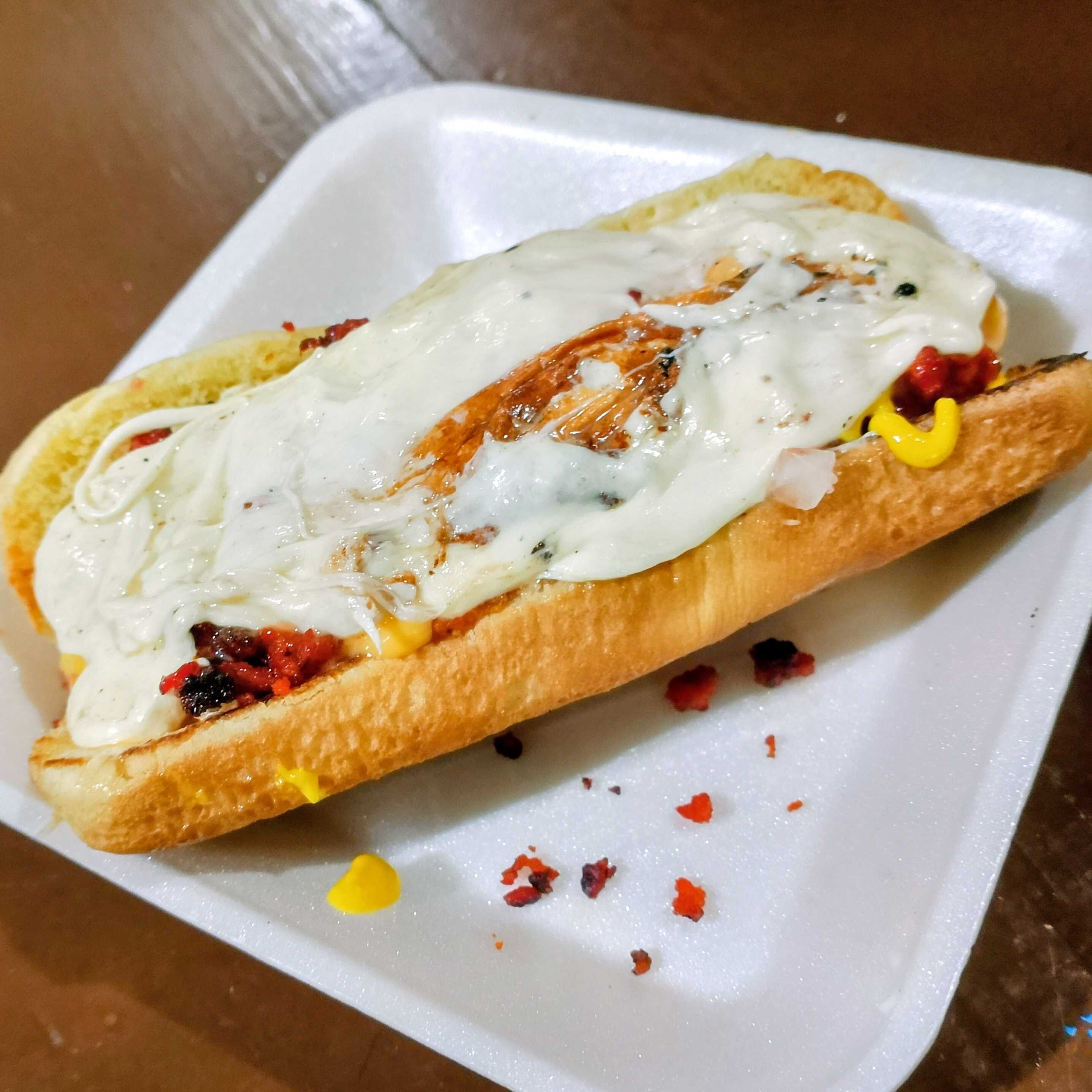 Pan de hot dog, salchicha de azar envuelta en dos tocinos, chorizo, queso de hebra, peperoni, jamón , tomate, cebolla, queso amarillo, capsut, mayonesa chipotle, mostaza