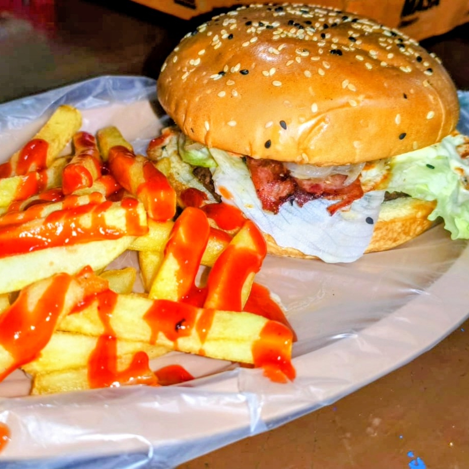 Pan de hamburguesa, carne de hamburguesa, lechuga, tomate, cebolla, capsut, mostaza, queso amarillo, mayonesa