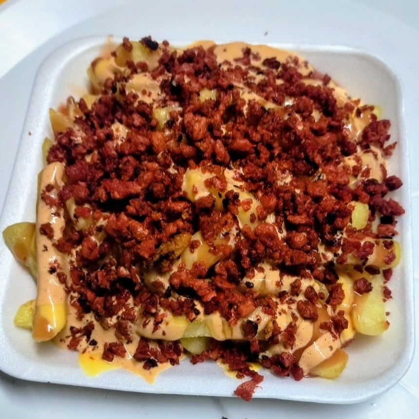 Papas fritas, chorizo, queso amarillo, capsut, mayonesa chipotle