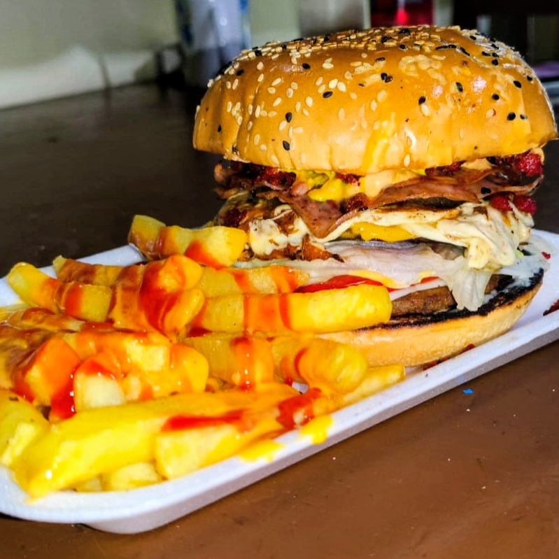 Pan de hamburguesa, doble carne de hamburguesa, tocino, chorizo, jamón, piña ,queso de hebra, rebana de queso manchego y amarillo, tomate, lechuga, cebolla, mayonesa, capsut, mostaza, queso amarillo, mayonesa chipotle