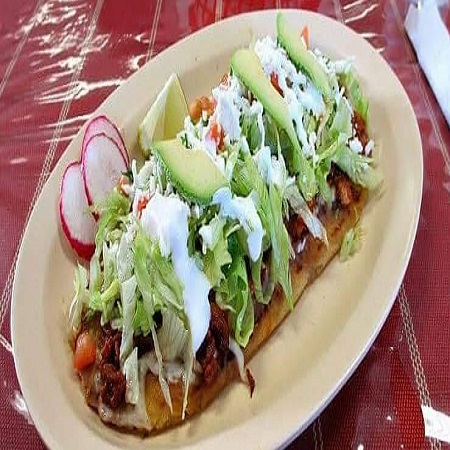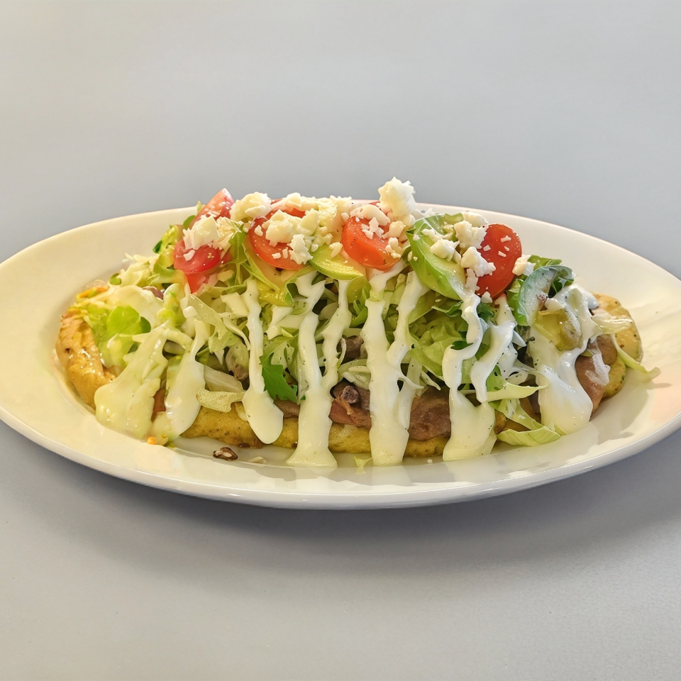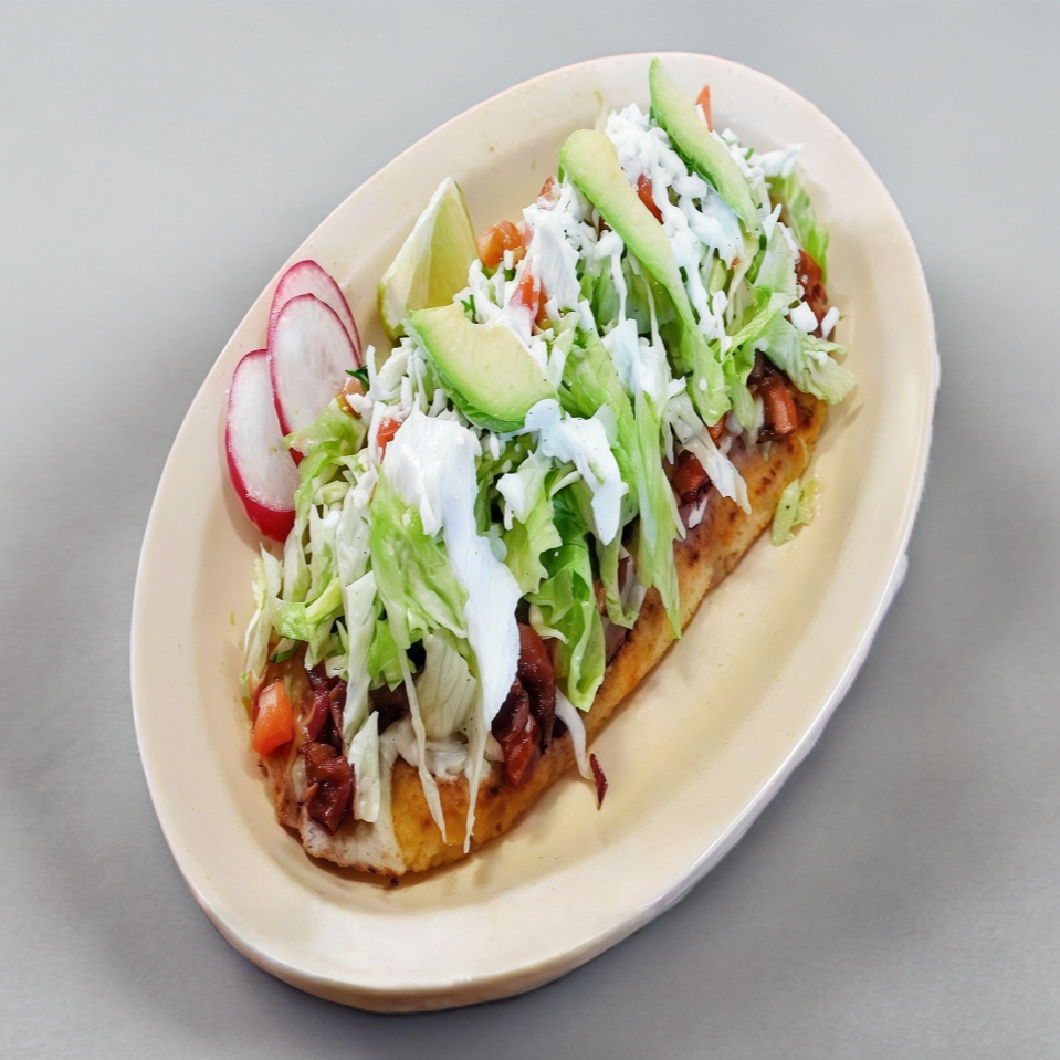 Tortilla grande de maíz con frijoles refritos +carne al pastor y queso de hebra + lechuga fresca, tomate, aguacate, crema y queso fresco
