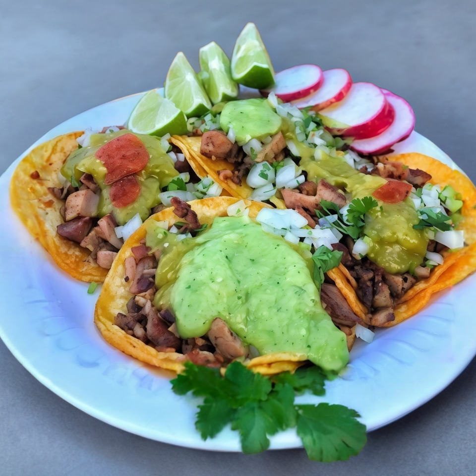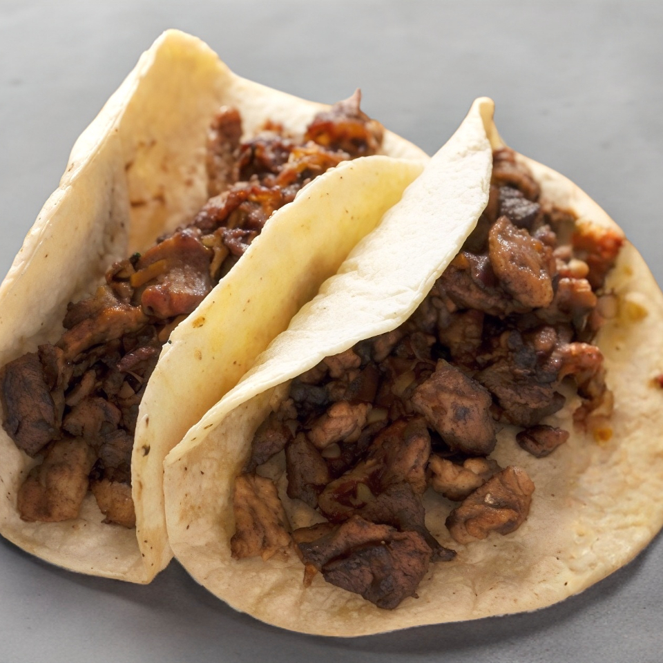 Tortilla de maiz hecha a mano rellena con carne al pastor de la casa
