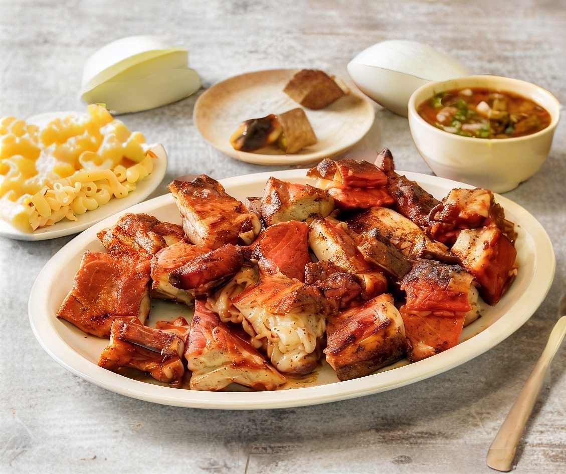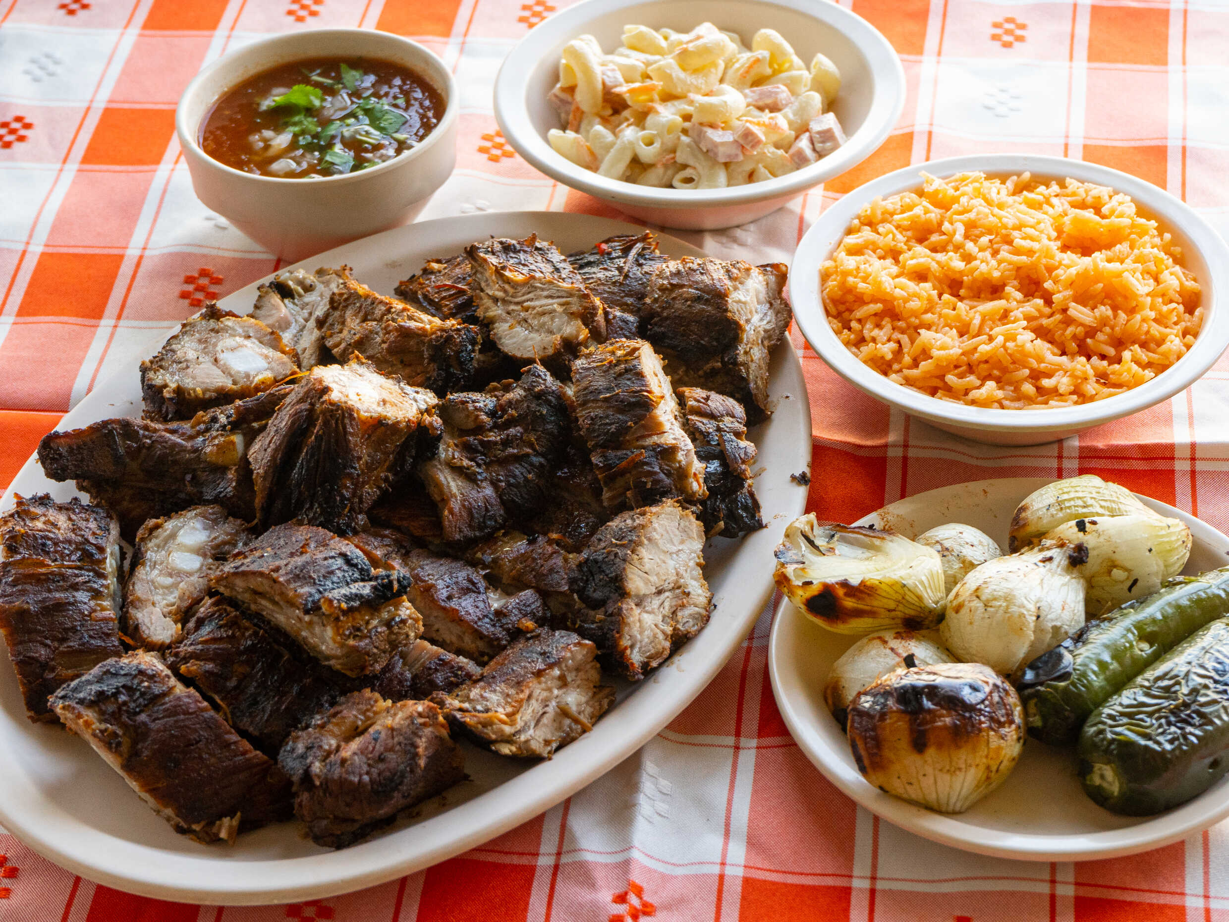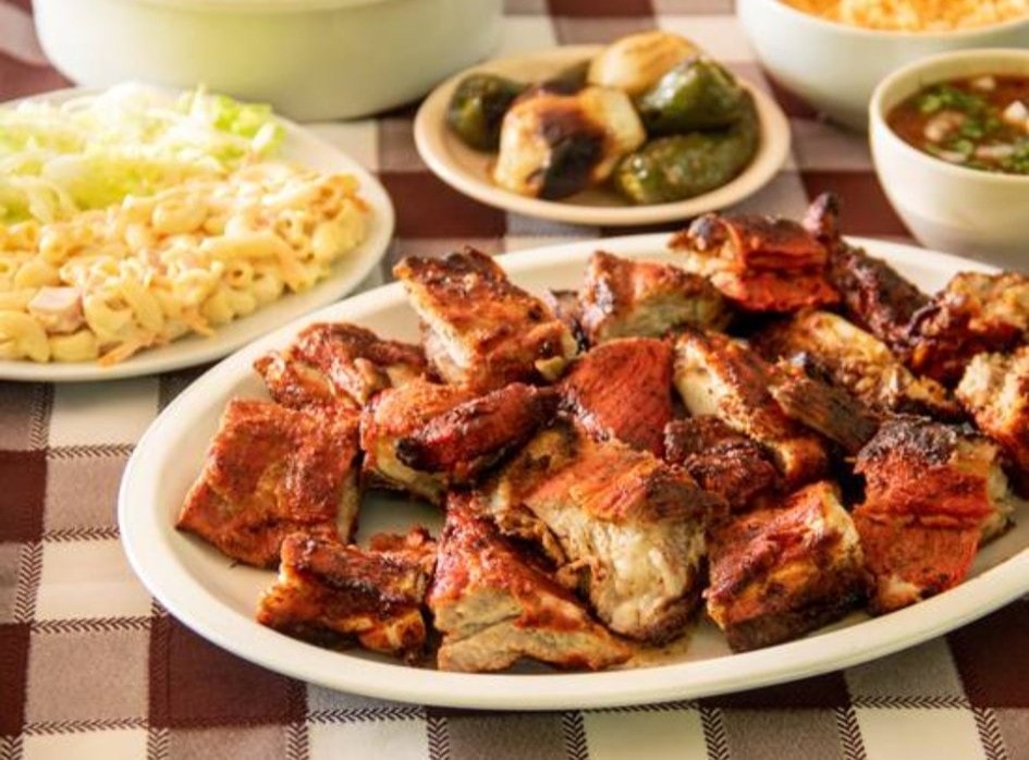 1 Kg costilla acompañada de arroz, salsa, tortilla y ensalada ,cebollín y chile asado.