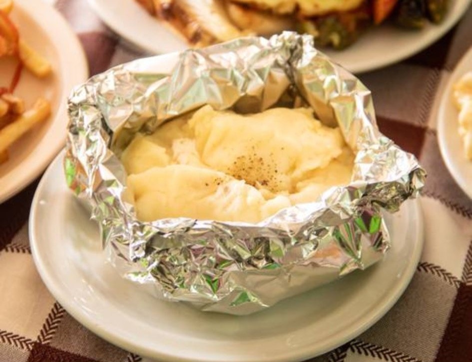 Puré de papa asada rellena con queso y crema.