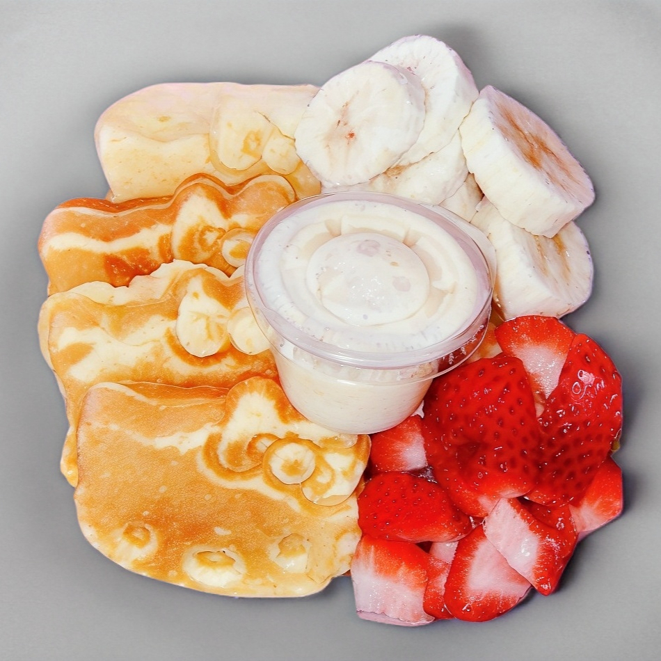 Hot cakes en forma de hello kitty 4 piezas con dos frutas a elegir y 1 topping liquido.
