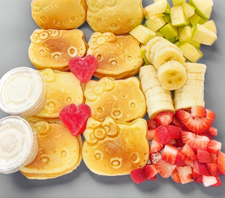 Hot cakes con forma de hello kitty con 8 piezas y 3 quesadillas con 3 frutas y 3 topping liquido