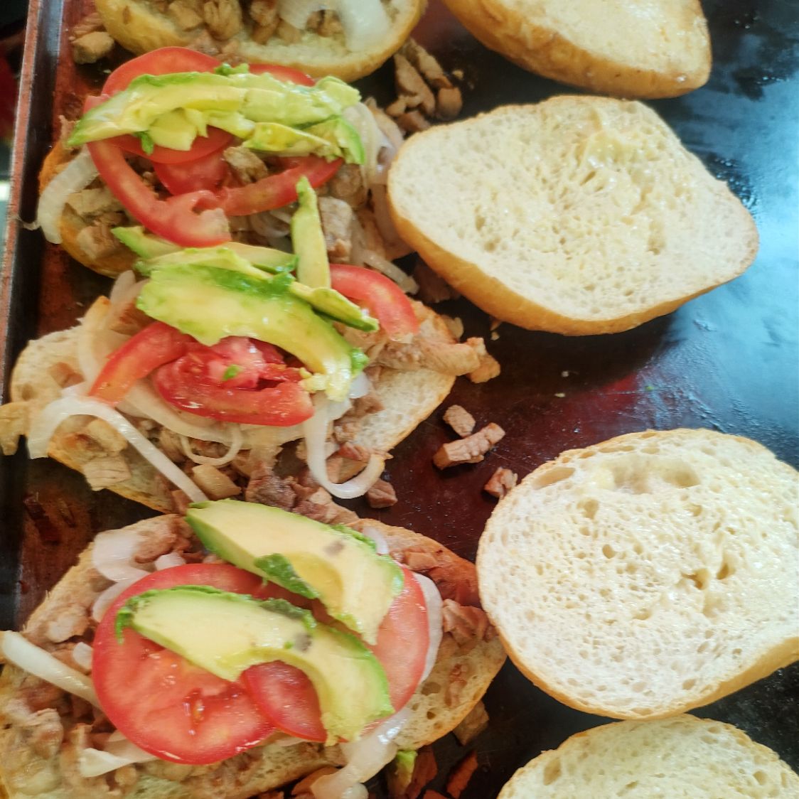 Pastor, cebolla asada, tomate, aguacate y mayonesa.