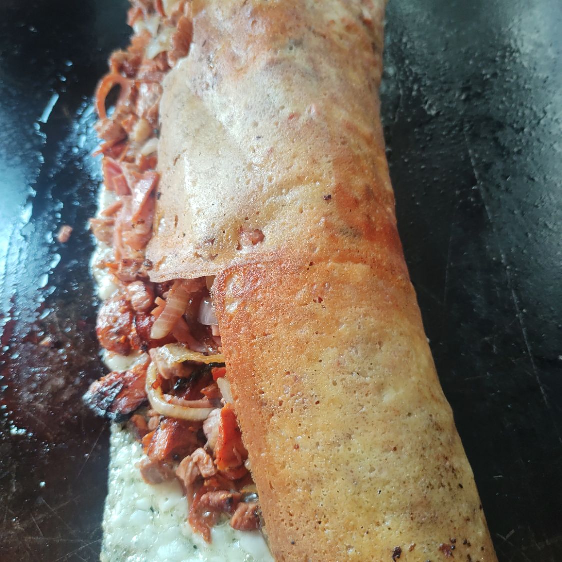 Milanesa de puerco,tocino,jamón,cebolla de ahí queso en costra envuelto