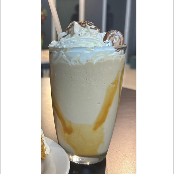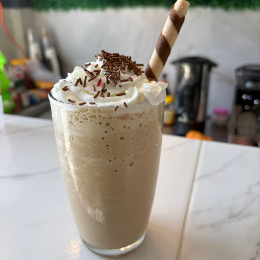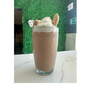Leche, shot de cafe, moka, Chantilly y topping de granillo.
