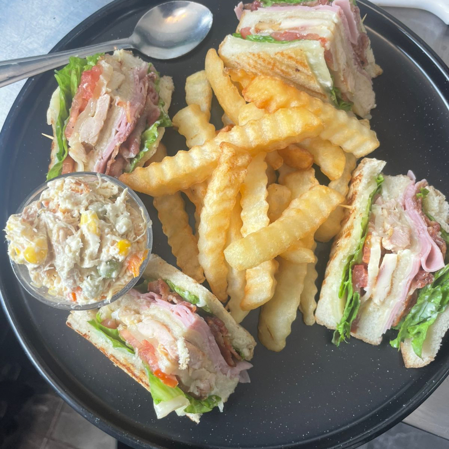 Club Sandwich Acompañado de Papas y Ensalada Rusa