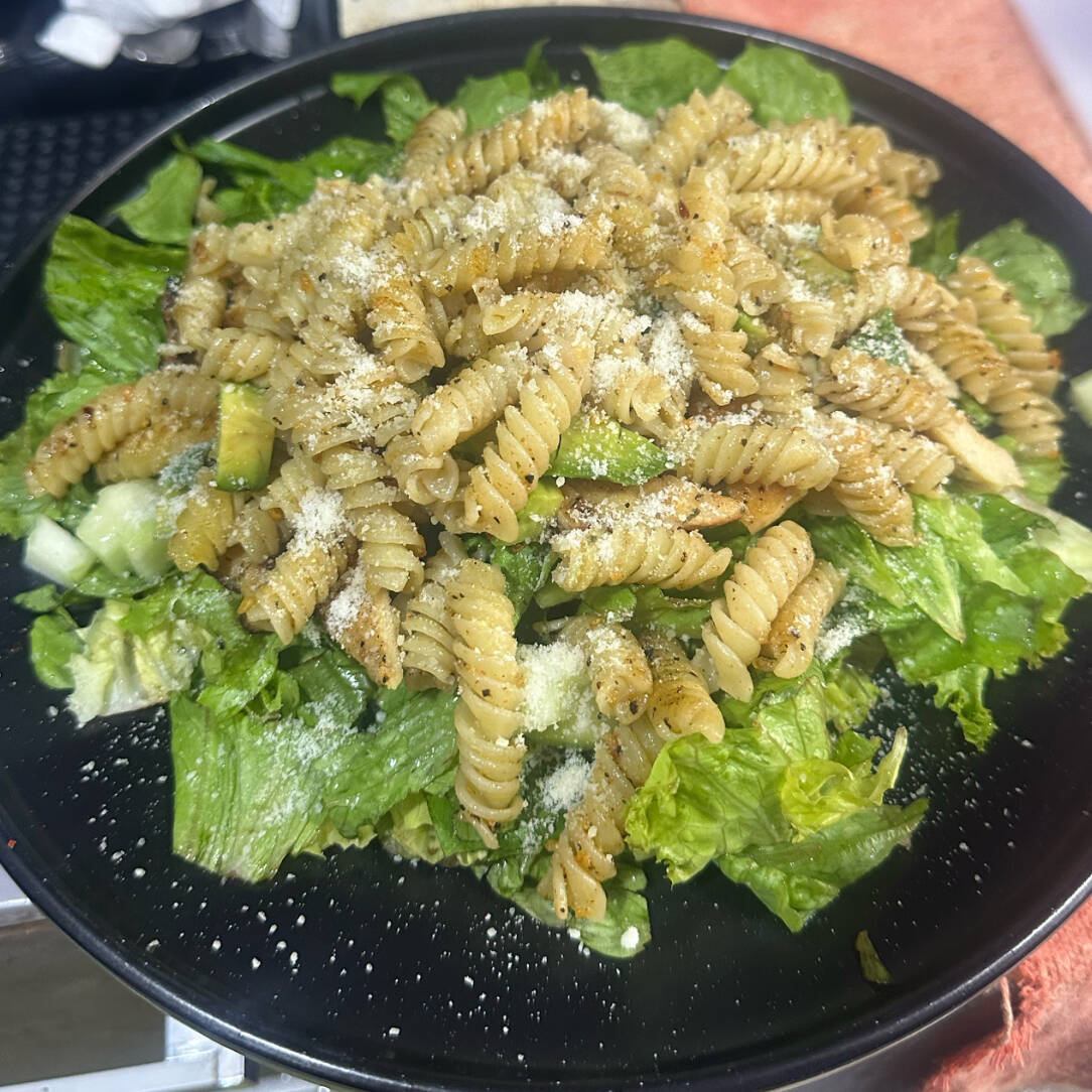 pasta, mix de lechuga, pepino, cubitos de aguacate, escoge la proteína de tu preferencia: *Pollo o huevo*
