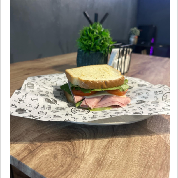 Jamón de pechuga de pavo, queso manchego, lechuga, tomate.