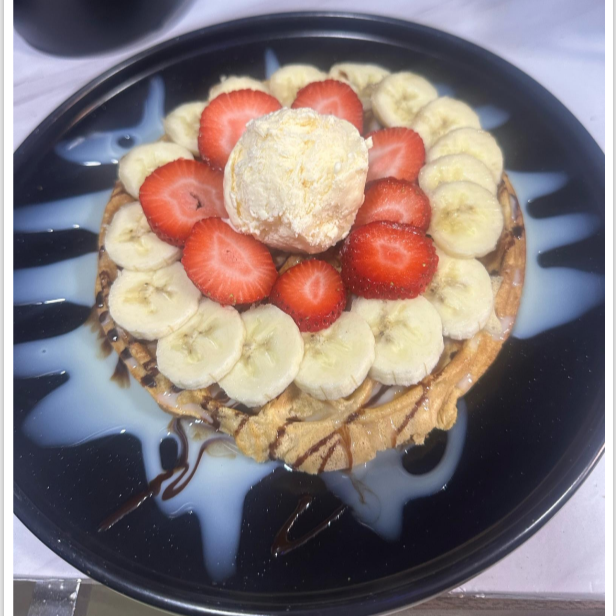 Fresa-platano/frutos rojos/fresa o frutos rojos con bola helado vainilla/oreo/M&M´s) ELIGE: Caramelo/Maple/Chocolate sobre tu waffle