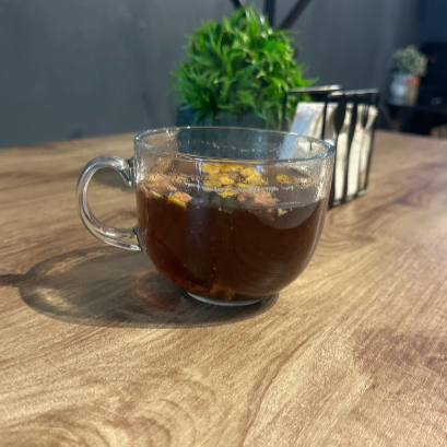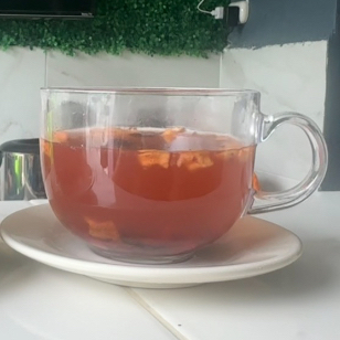 TISANA FRUTAL ACOMPAÑADA DE PETALOS DE CEMPASUCHIL Y OTRAS FRUTAS DELICIOSAS.