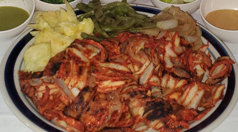 Pastor 13 tortillas, cilantro, salsa de cacahuate, salsa verde, limón,cebolla,cebolla asada, piña y nopales
