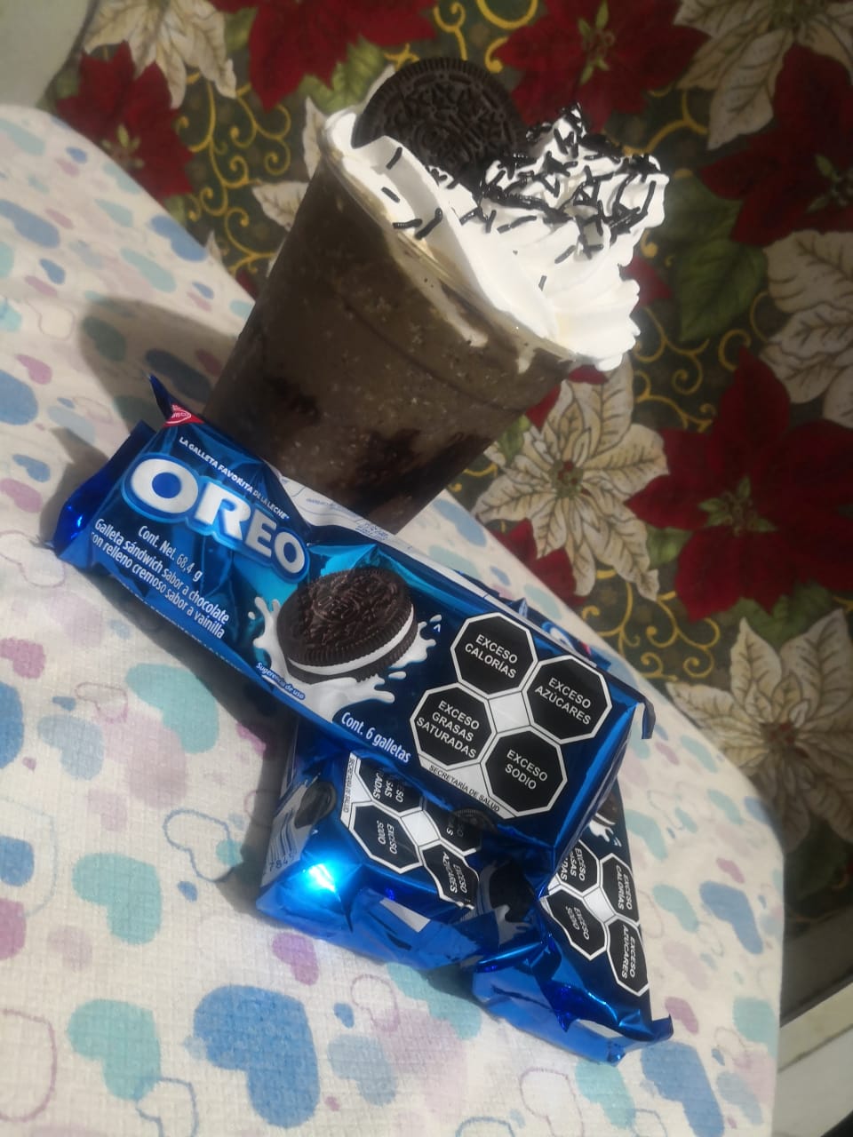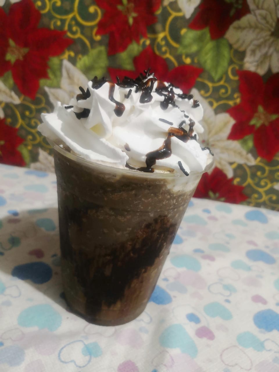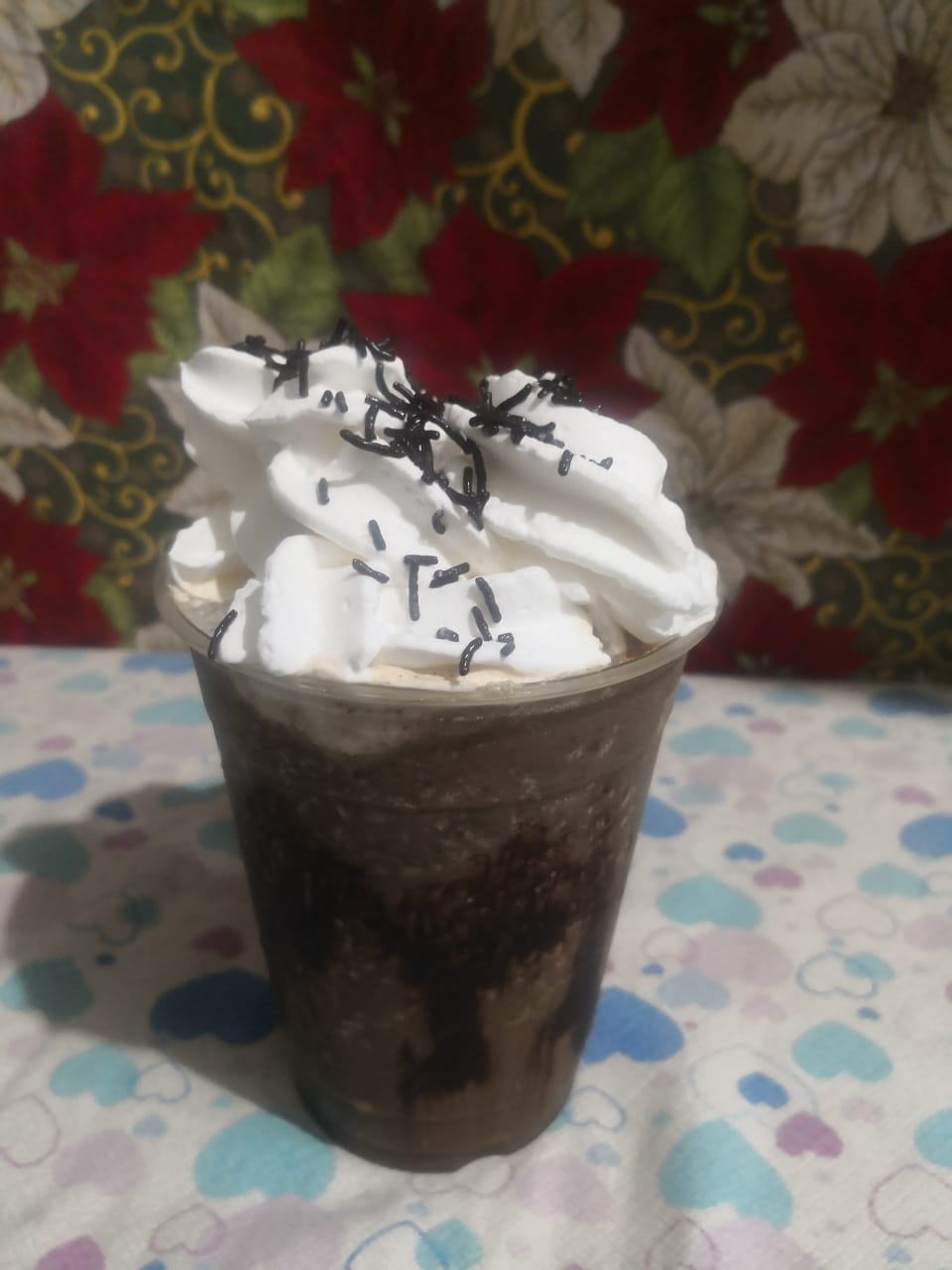 Delicioso frappé con chocolate y café, crema batida y chispas