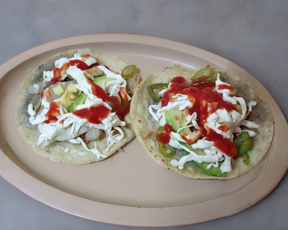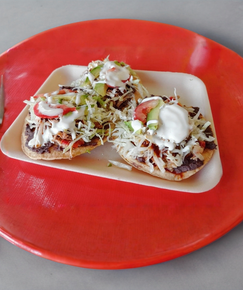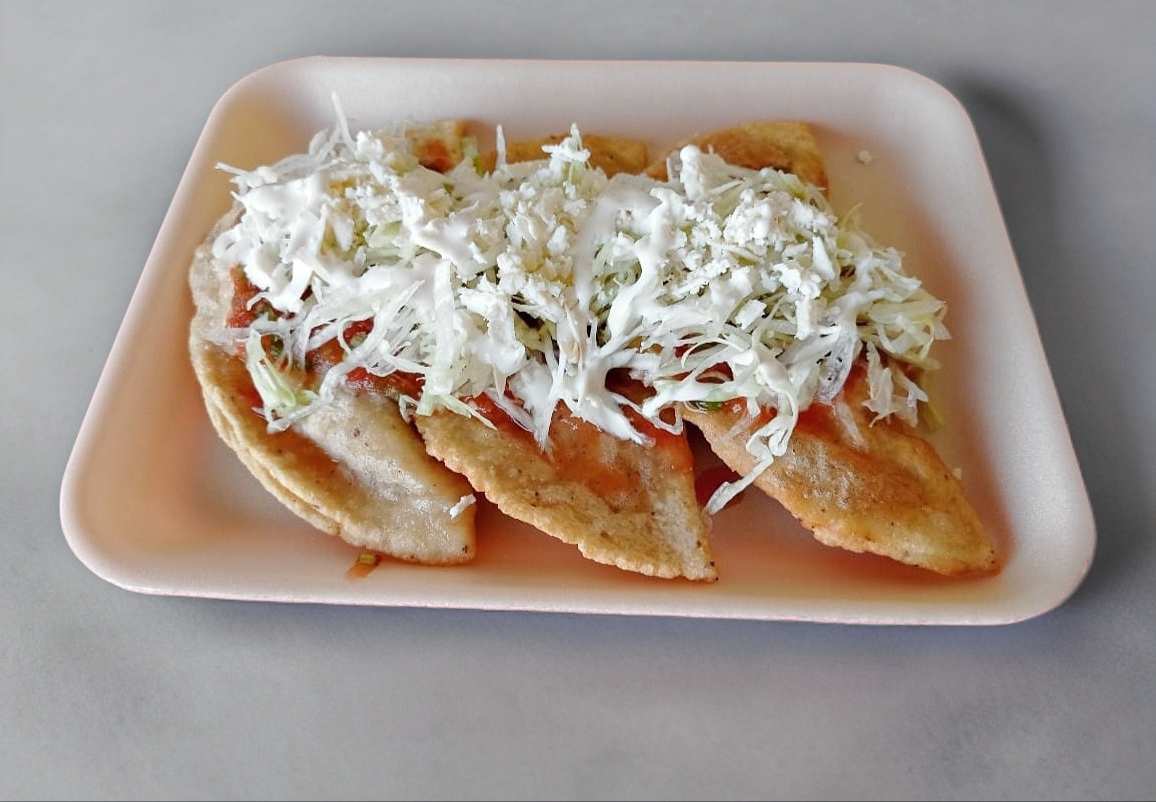 Tortilla frita, preparada con frijoles, pollo, lechuga, queso, crema, tomate, aguacate y salsa a elegir.