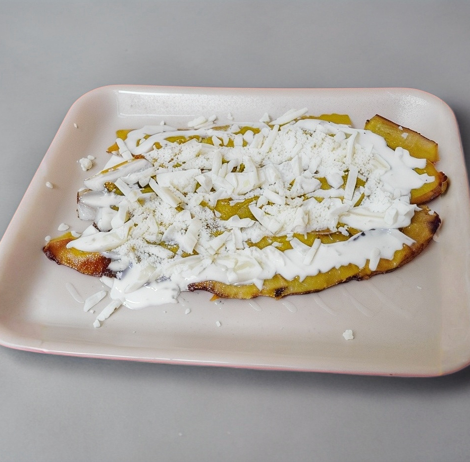 Plátano macho frito con crema y queso.