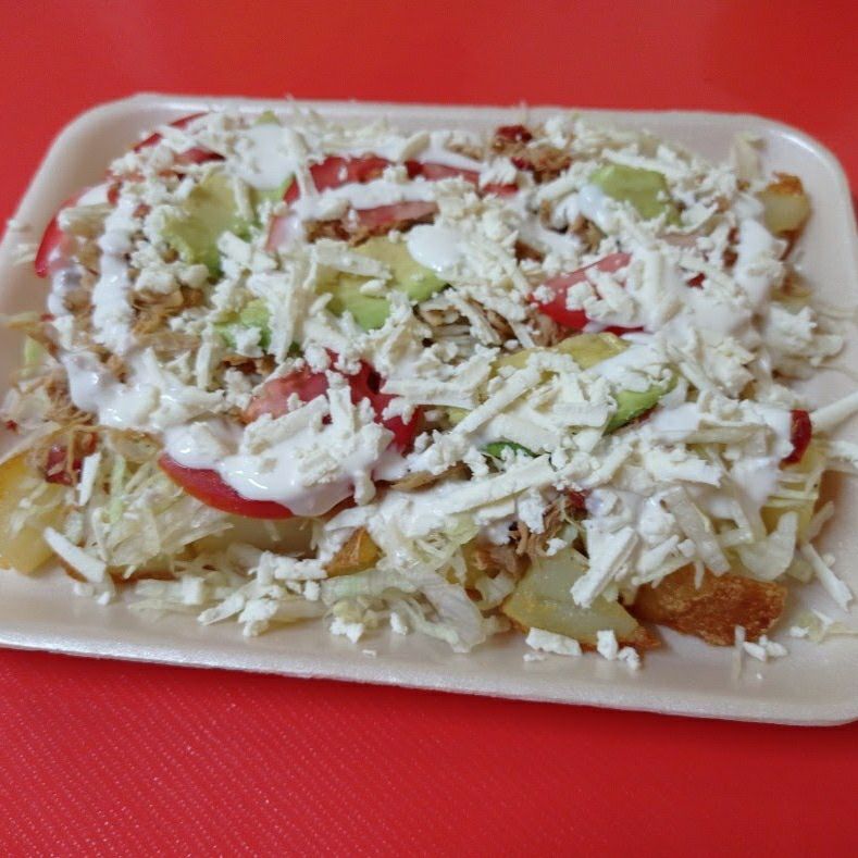 Papa frita con lechuga, crema, aguacate, queso, salsa, ingrediente a elegir.