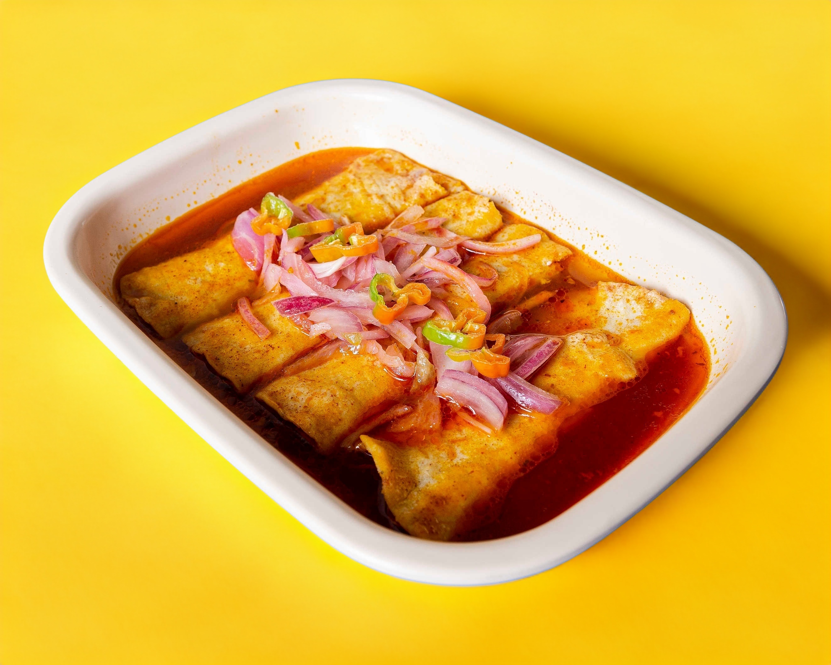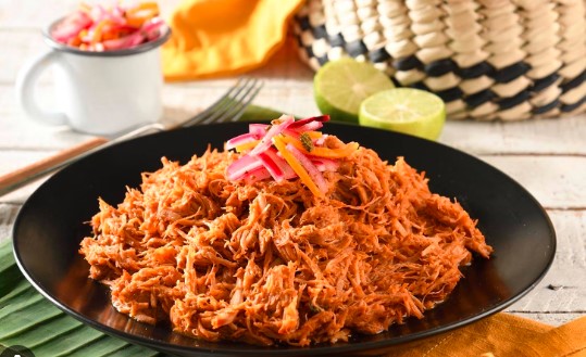Deliciosas tortillas bañadas en una salsa de pibil con una porción de cochinita pibil y adornadas con cebolla morada, chile habanero, queso fresco y crema.