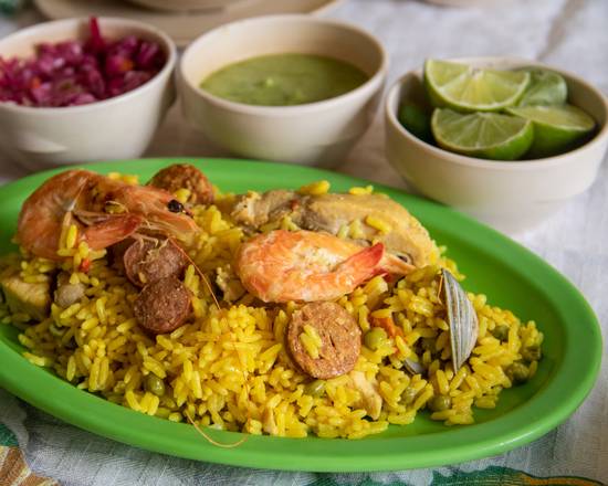 1 Kilogramo de nuestra deliciosa paella valenciana hecha con arroz, pollo, carne de puerco, chorizo, salchichas ahumadas, mariscos como almejas o camarones, verduras como chícharos y ejotes.