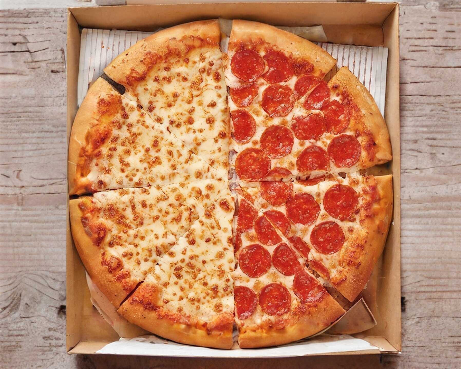 Masa madre del día, salsa de tomate ligeramente condimentada, mitad pepperoni, mitad 3 Quesos.