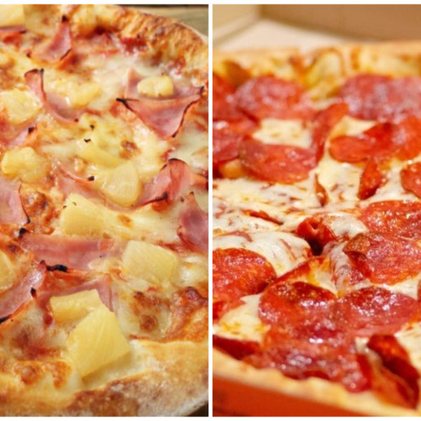 Masa madre, salsa de tomate ligeramente condimentada, mitad Hawaiana y mitad Pepperoni