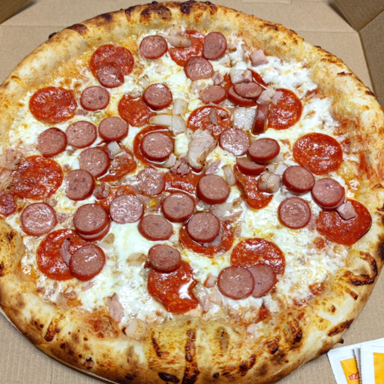 8 rebanadas, salsa de tomate condimentada ligeramente, queso mozzarella , salchicha de res, tocino y pepperoni, elaborada artesanalmente y horneada en forma tradicional.